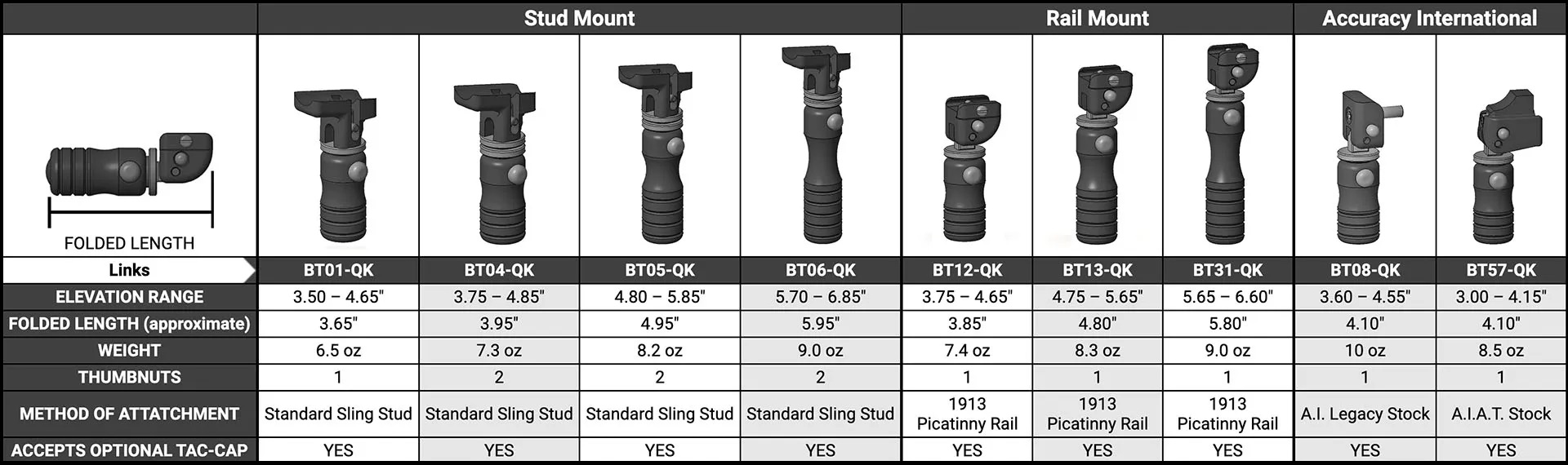 Sling Stud - The Sling Stud Mount Monopods attach to angled rifle stocks using the Sling Stud found on many common rifles. They install easily with the included 3/32” Allen wrench. All models, except the BT01-QK, feature a thumbnut for fixed elevation. The vertical height adjusts with a button and folds away for sling use with the Sling Stud attachment.
