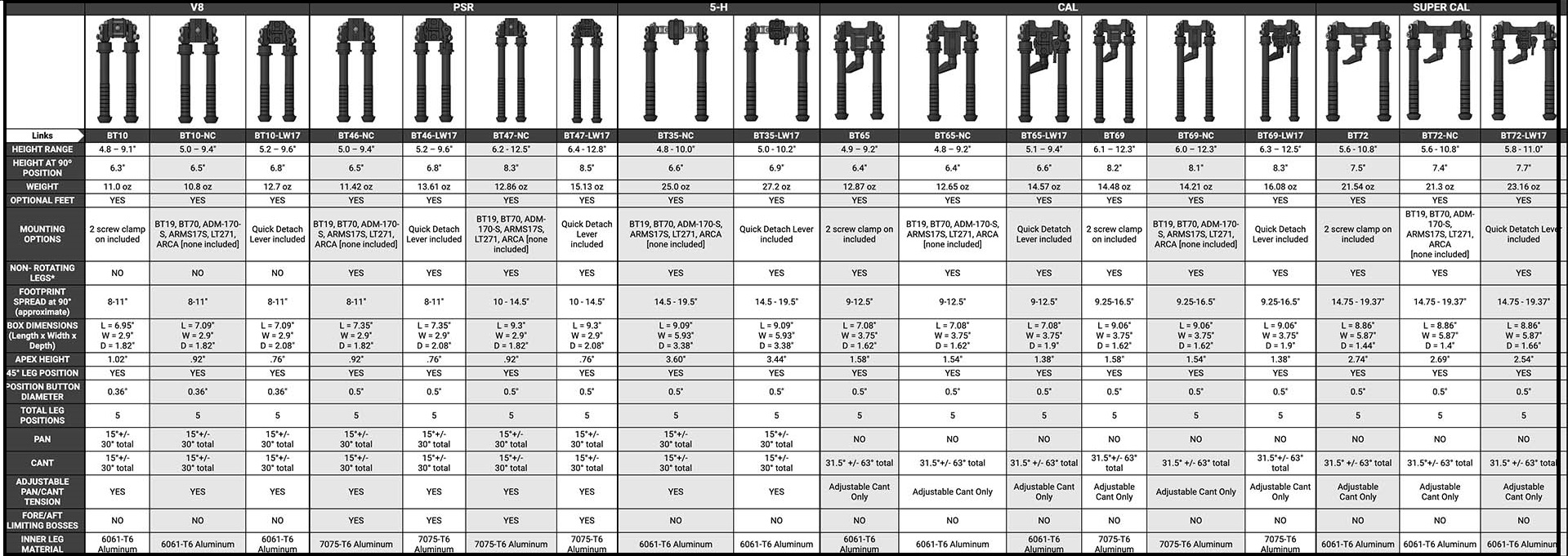 5-H - The 5-H is our “bigger and heavier” Bipod that will both Pan and Cant. It is designed for larger caliber rifles while finding value with all calibers to include precision air rifles. It offers the same Atlas features to include five, independent leg positions and height adjustability, but in a design that offers extreme stability.