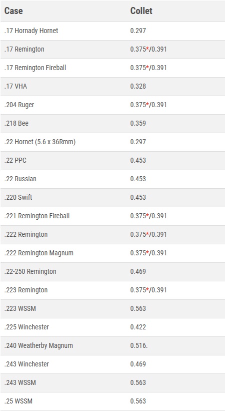 Collets work in our ergonomic Case Holder. Secure a wide range of cases for primer pocket work (head-facing) and, for most rimless cases, case mouth work (neck-facing). This tool accepts hundreds of cartridges thanks to a wide range of collets.