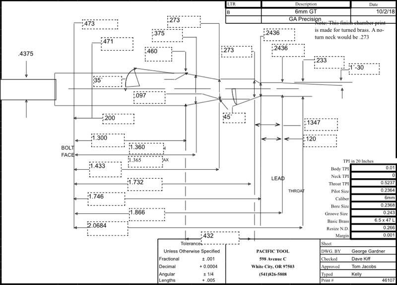 The GT in 6mm GT, stands for George and Tom, the two guys who developed the cartridge, out of the need to have a 6mm cartridge that can use the forgiving propellants that the 6BR, 6BRX, 6BRA and 6mm Dasher use providing large nodes making load development easier for each new barrel, whilst still being able to feed from a magazine reliably like a 6mm Creedmoor. They also wanted it to be more forgiving on the barrel life, and still provide comparable high muzzle velocities with tight twists required to stabilize the long high-BC 6mm bullets.